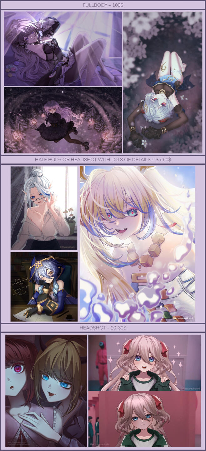 • Removing or altering any watermarks/signatures without the consent and knowledge of the artistYou may purchase commercial rights for illustration commission (1.5-2x of the original rate but price will vary. If you want a commercial license please let me know right away).- Client can request for their piece to be posted publicly (if I post your commission, I will sign that you are the customer), posted as secret commission (if I post your commission, I will not sign who the customer is), or kept PRIVATE* (I will not post your commission, you will need to pay fee for this option).COMMISSIONS ORDERING• To guarantee total accuracy to your commission request, please make note of the required details and elements in the form.